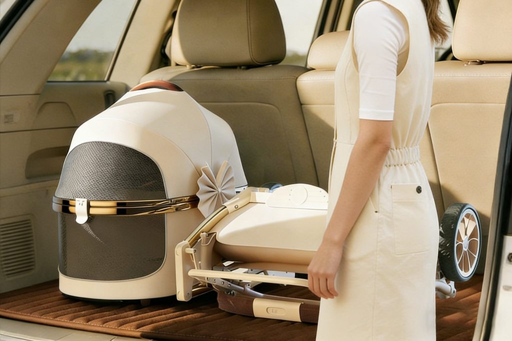 A stylish pet stroller designed with a modern, elegant silhouette.